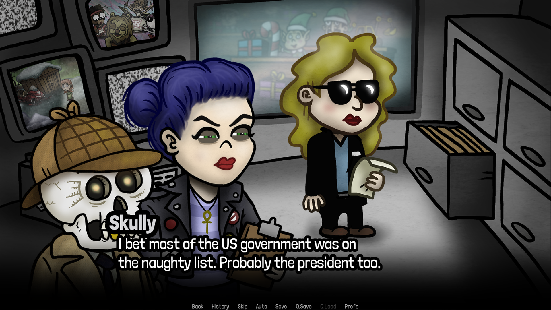 Santa Claus, the King of Christmas, has been murdered. Brutally butchered in his Throne Room on the North Pole. Our dynamic duo of deduction and delinquency, investigative journalist Deliria B. Murder and the undead detective Skullbert "Skully" McSkullface, arrives to the scene in a timely manner, ready to get to the bottom of this scandalous scoop and most-likely-illegal impalement.